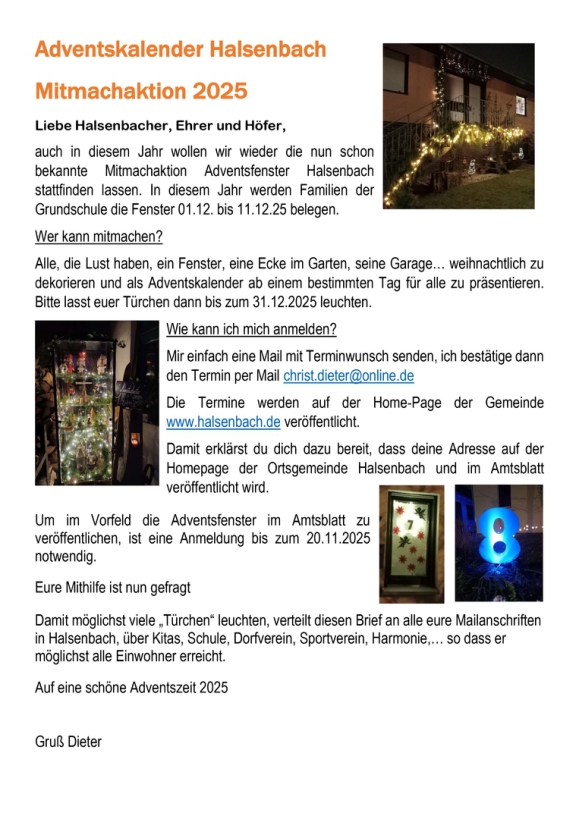 | Dorfverein Halsenbach -> | 14.00 - 16.00 Uhr, Vortreffen im Dorftreff, dann Wanderung zur lebenden Grippe auf dem Mermicherhof. | |